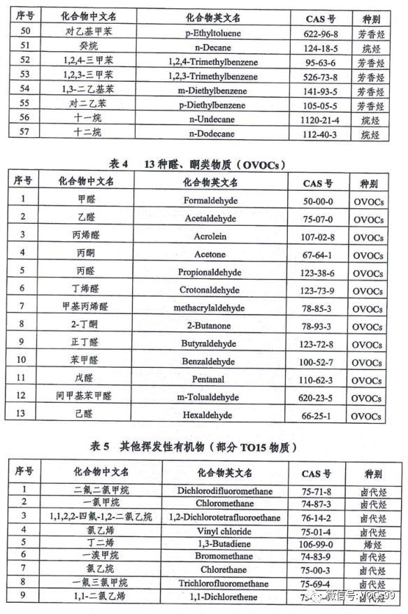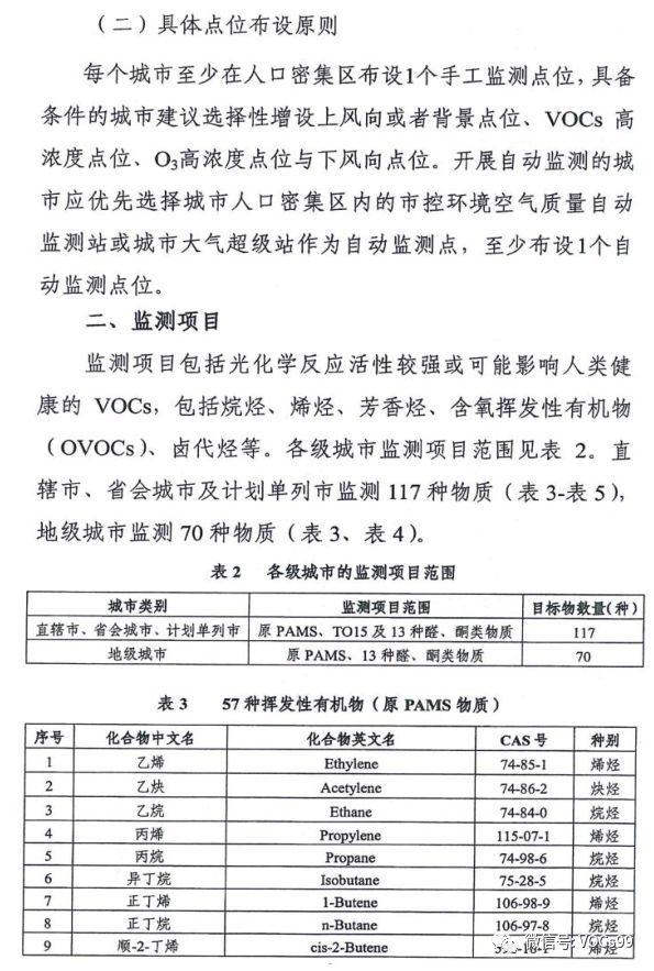 監測項目包括光化學反應活性較強或可能影響人類健康的VOCs,包括烷烴、烯烴、芳香烴、含氧揮發性有機物(OVOCS)、鹵代烴等。各級城市監測項目范圍見表2。直轄市、省會城市及計劃單列市監測117種物質(表3-表5),地級城市監測70種物質(表3、表4)。